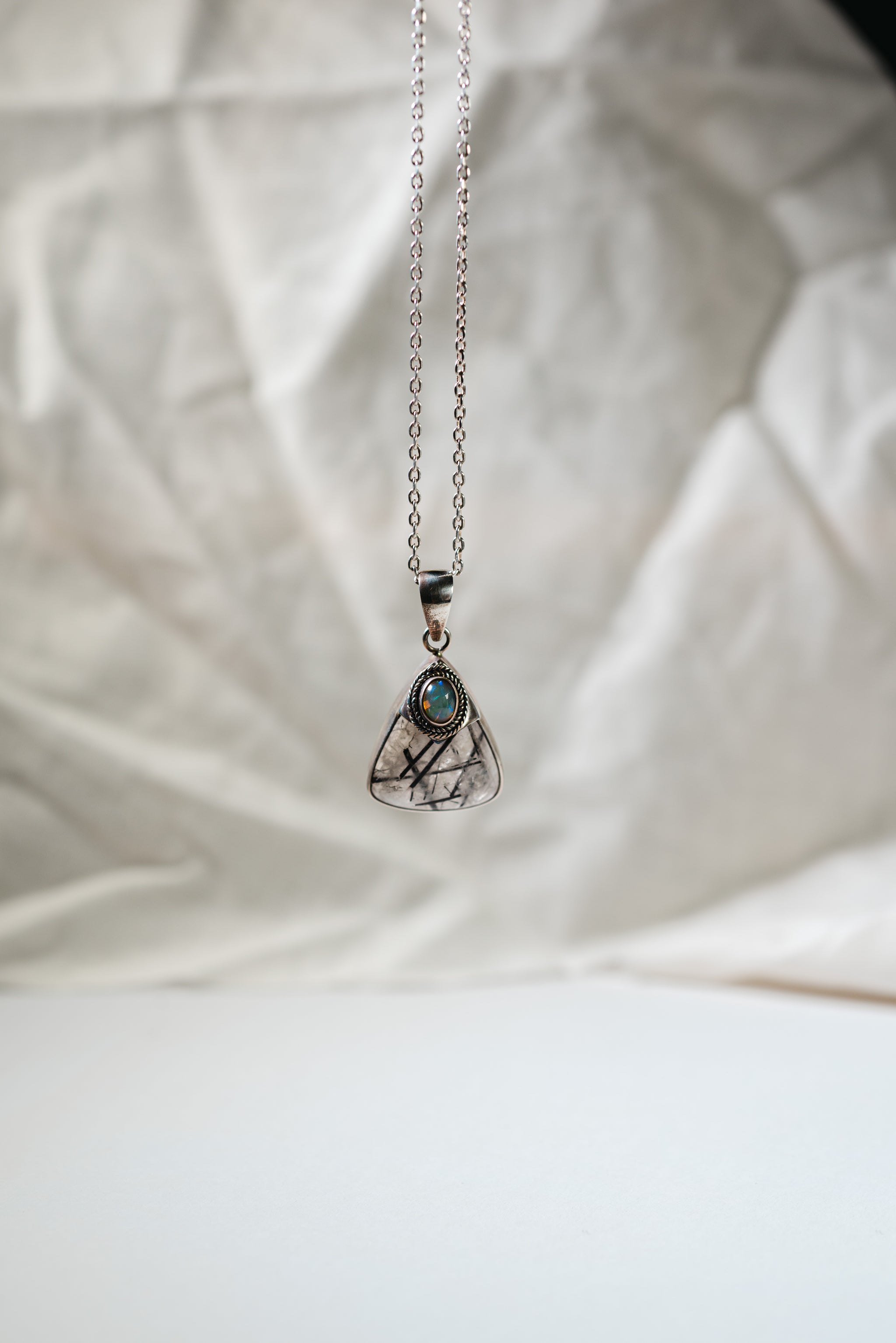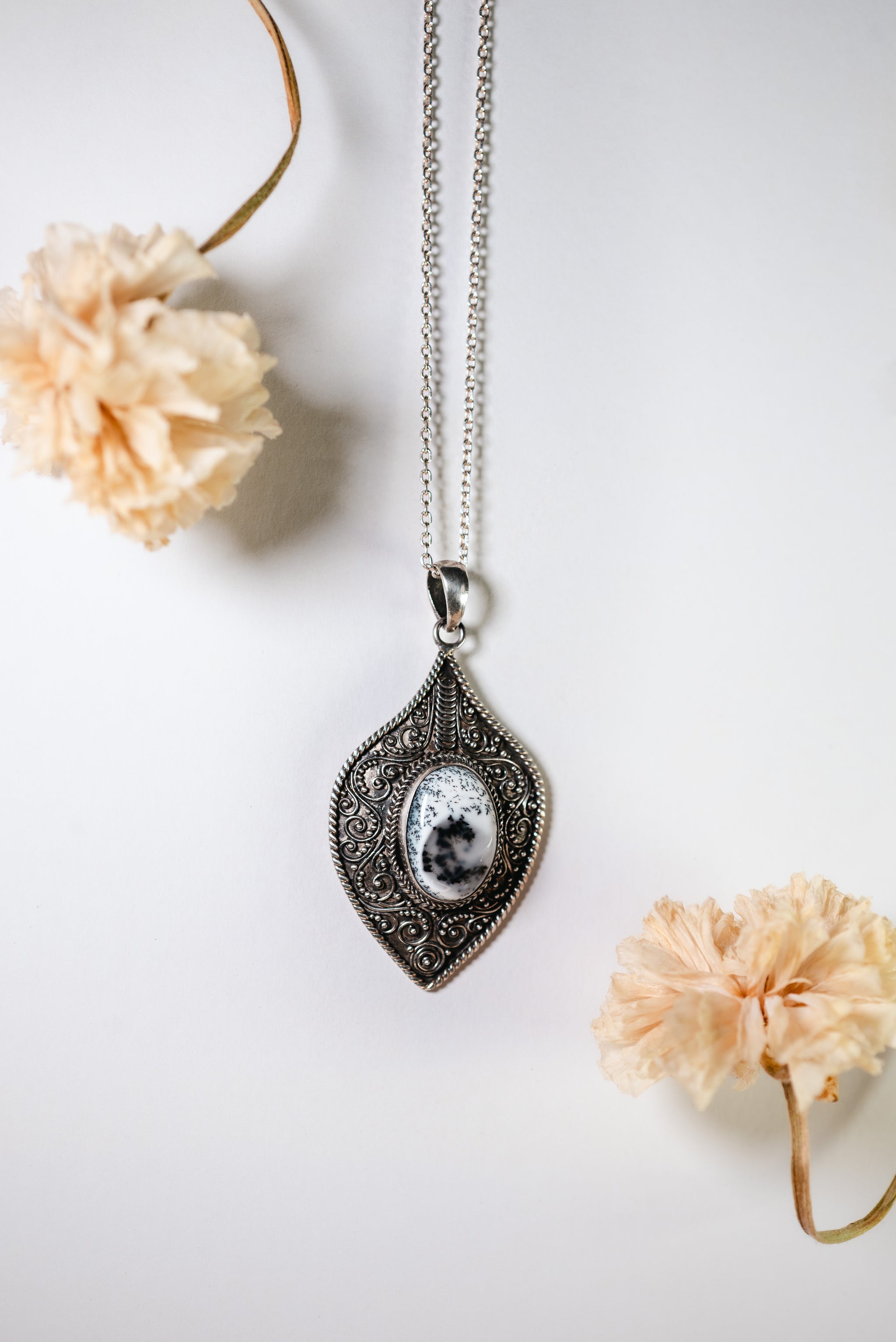 Sterling silver dendritic agate pendant with inclusions called 'dendrites' that resemble tree branches, ferns, or bolts of lightning. It is also known as the "Stone...